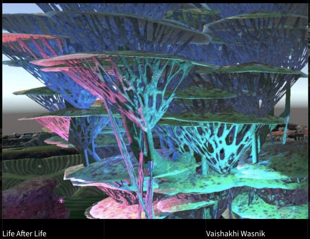철제 건물과 자연 풍경이 어우러진 현대 미술 작품, 창의적 예술체험.