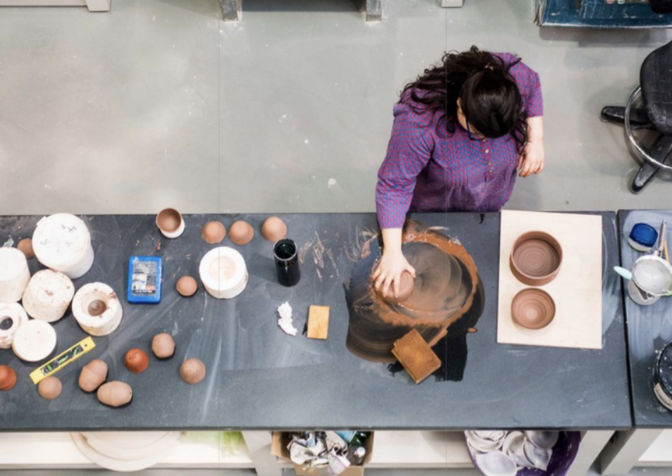 배터시 캠퍼스에 위치해 있으며 ‘도자기’ 만들기 ‘유리’공예를 넘어서, 재료와 그 성질을 이해하고 이를 응용한 작품제작과 작가로서의 리서치 할 수 있는 능력을 기릅니다. 디자인과 순수미술의 경계를 가로지른 주제와 작품 제작을 원하는 학생분들께 추천. 아래 사진은 세라믹과 글라스 스튜디오의 책상.